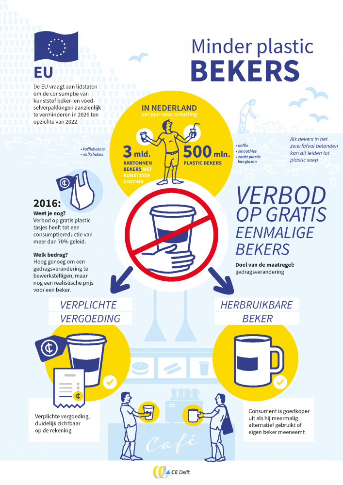 Uit recent onderzoek door CE Delft blijkt dat een verplichte vergoeding van € 0,25 voor een wegwerpbeker hoog genoeg lijkt voor een gedragsverandering. Bekijk hier de infographic van CE Delft met de conclusies van hun onderzoek.